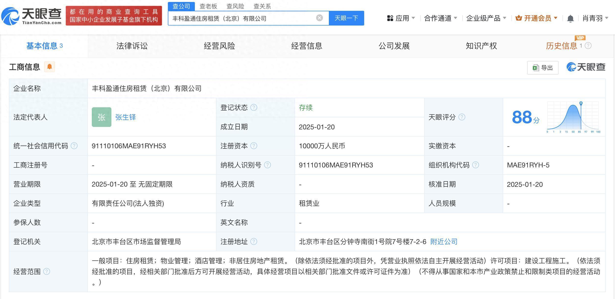 天眼查App显示,近日,丰科盈通住房租赁(北京)有限公司成立,法定代表人为张生铎,注册资本1亿人民币,经营范围包括住房租赁、物业管理、酒店管理、非居住房地产租赁等。股东信息显示,该公司由中国诚通控股集团有限公司全资持股。
