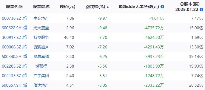 1月22日,房地产板块走低,截至13时35分,中交地产(000736.SZ)跌停,光大嘉宝(600622.SH)跌超9%,特发服务(300917.SZ)、深振业A(000006.SZ)等跌幅居前。